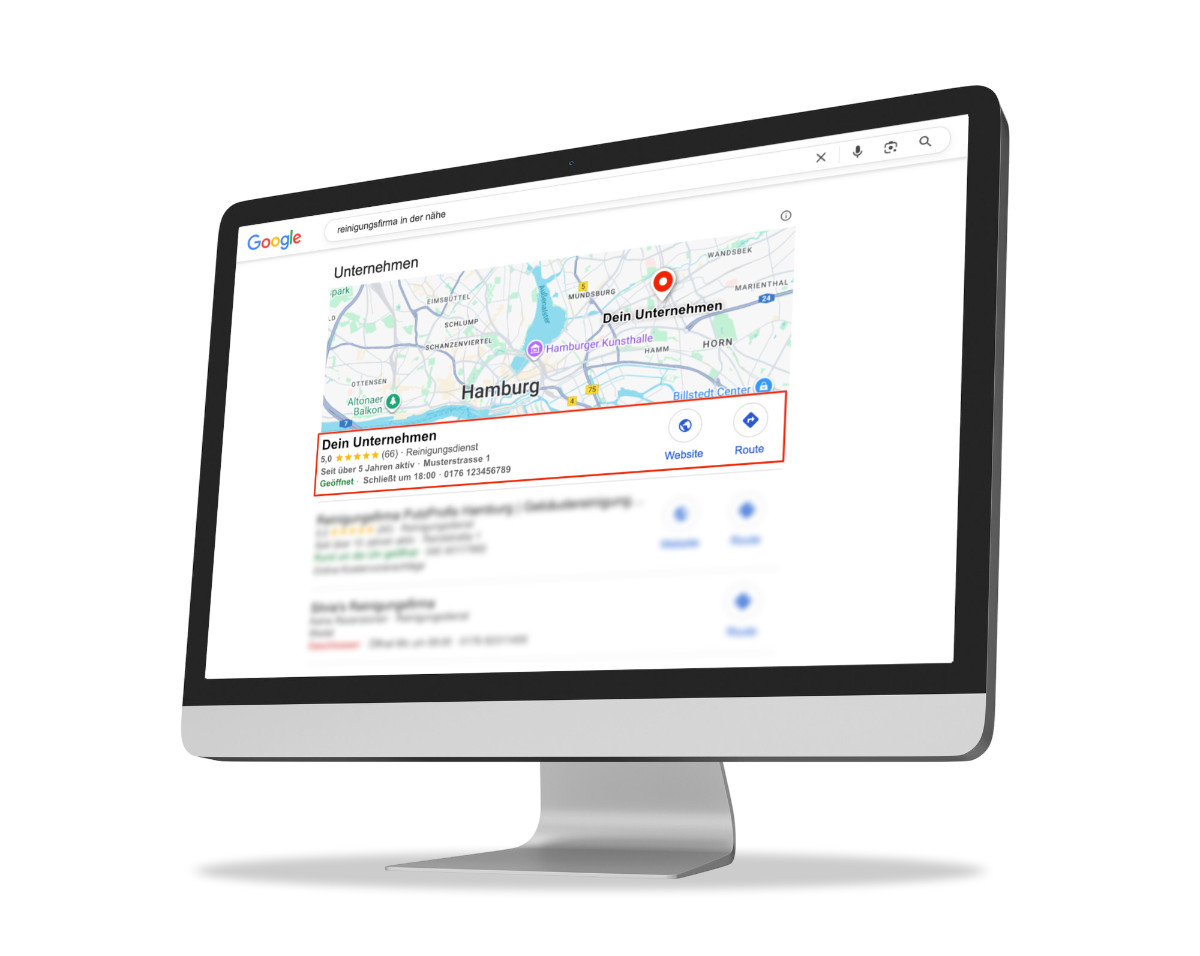 Wenn jemand „Friseur in Hamburg“ oder „Reinigungsdienst Hamburg“ googelt, erscheint dein Unternehmen genau dort, wo deine Kunden suchen – lokal sichtbar, relevant und mit hoher Klickwahrscheinlichkeit.